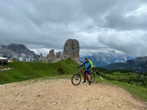 Tag 4: Von Cortina aus erklimmen wir die Forcella Nuvolau. Die für ihre steilen Felstürme bekannten Cinque Torri sind eines der bekanntesten Klettergebiete in den Dolomiten. Nach einen 250 HM steilen Anstieg (ca. 30 Minuten Schiebepassage) erreichen wir den Refugio Averau. Nach der Einkehr erwartet uns ein Downhill- Feuerwerk, die „Strada de la Vena“. Der Trail führt über die Almfläche nach unten. Ab der Waldgrenze werden die Wege etwas breiter, aber auch steiler Der Trail endet in Alleghe mit seinem kleinen Bergsee. Nach weiteren 20Km auf dem Radweg erreichen wir unser Tagesziel in Falcade
